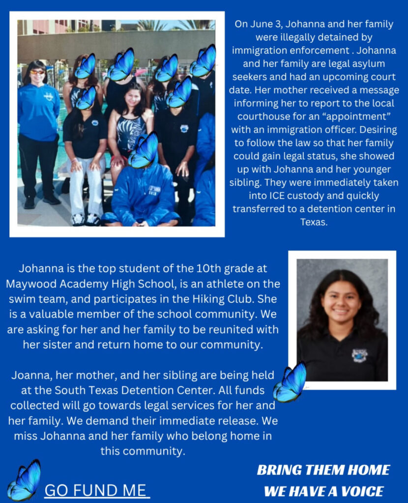 Students Deserve MAHS, a school club the students interviewed for this story are part of, helped organize a walkout earlier this year to protest the immigration raids. After Johanna was detained, Duran shared her story at an LAUSD board meeting, asking the board to support their efforts. She said she never heard back from them. Students also helped Hector, Johanna’s father, publish a fundraising page that raised over $21,000 and made flyers that were shared widely on social media.