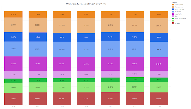 You’ll probably notice that the patterns are about the same, but you see the effect of the California Community Colleges here: Many more students don’t attend four-year colleges in the state, which makes it different from other parts of the country. For reference, here is the same visualization showing all undergraduate enrollment in all institutions (not just in The Filter Set). You’ll note the re-balancing, which is a function of the vast majority of college students going to college close to home.