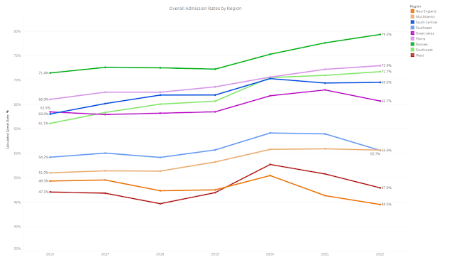 Over time, the percentage of first-year applications submitted has grown in the Southeast, but not the Southcentral region. Actually, what’s remarkable about this chart is the consistency over time.