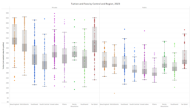 For another thing, they cost a lot less, on average, based on sticker price. Each dot represents one college, and the gray boxes cover the middle 50%, with the divider between dark gray and light gray showing the median. You can see that for both public and (especially) private colleges, tuition seems to be much lower than other places. I’ve not tried to normalize this by Carnegie type or selectivity, to be clear.