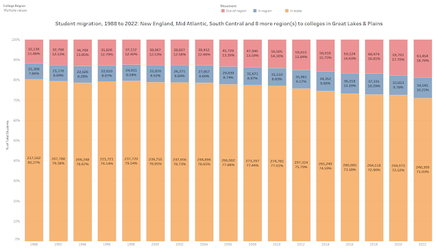 Here is the historical pattern of first-year student migration, from 1988 to 2022. As you can see, about seven of ten students stay in their own state for college, which means the number of students who cross state lines is small, making even big swings in those patterns hard to measure and describe as meaningful. It’s also interesting to note that more students today are more mobile than in the past, for a lot of reasons I won’t go into here, but as always, you can start the finger pointing with Ronald Reagan.