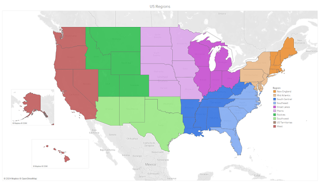 First, let’s take a look at the shape of the market to have a place where we can put our feet down. We’ll start with WICHE data, which I’ve found to be very reliable, but of course imperfect, showing high school graduates over time, with years after 2019 being projections. For all of these views, I’ve broken things out by my own state regions, colored on this map. (Click it or any image to view larger).