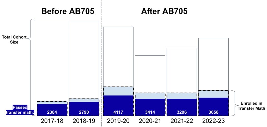 A 2017 law, Assembly Bill 705, changed that. It used high school grades for placement and gave more students direct access to transfer-level courses, with corequisite support (a support course taken concurrently with a transfer-level course) when needed. Instead of multi-semester remediation, students could move into transfer-level math courses faster.