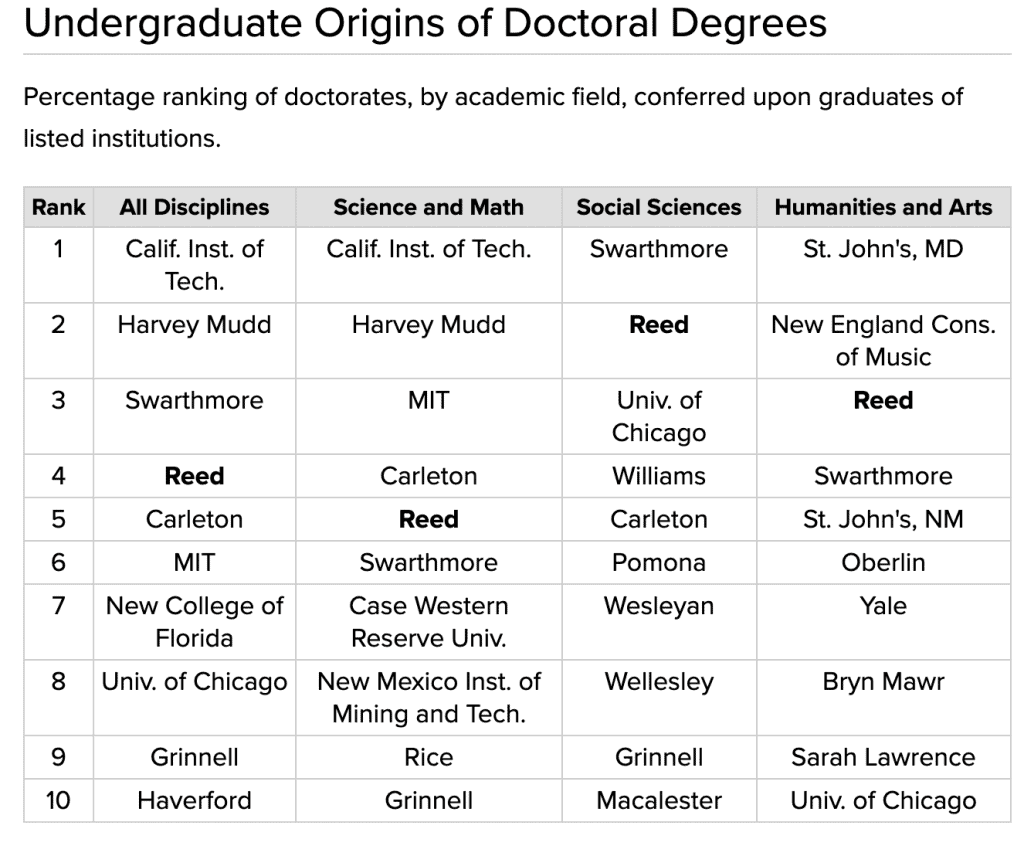 This reality might be why liberal arts colleges dominate the list of the higher-ed institutions that produce the greatest percentage of grads who end up earning PhD’s. Here is a chart with the top schools.