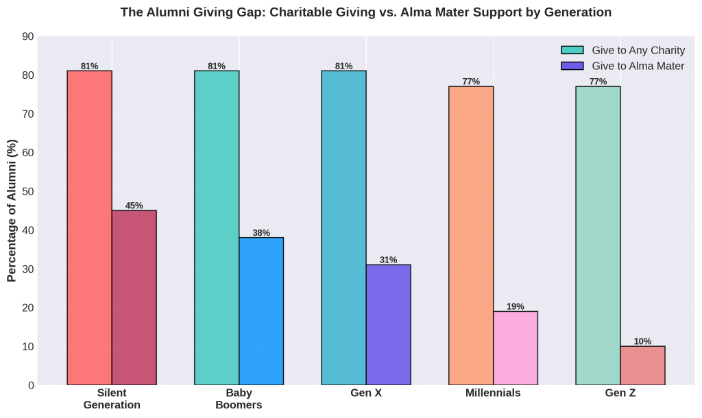 Even more troubling: 59% of alumni who never donate to their alma mater actively support other causes, as do 83% of lapsed donors. They have not stopped giving—they have simply redirected their philanthropy elsewhere. This suggests that alumni disengagement reflects institutional failure rather than generational selfishness.