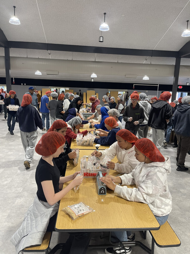 On each side of a cafeteria table, students sporting red hairnets and plastic gloves measured and assembled nutritionally balanced portions of dried rice, vegetable protein, vitamin packets, dried tofu and protein additives into pre-labeled bags. They then rotated each bag to teams of students who stapled, heat-sealed, and counted each package to be ready for distribution worldwide.