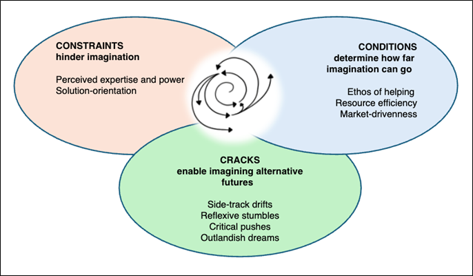 Our research shows that political imagination is shaped by a dynamic between three elements: constraints, conditions and cracks. This dynamic suggests that political imagination is a fragile yet meaningful mode of political agency.
