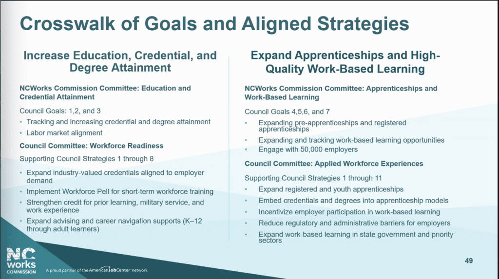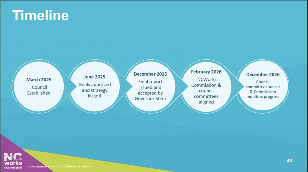 “We now stand at a pivotal moment where strategy development is transitioning into action,” said N.C. Secretary of Commerce Lee Lilley, who is also a council co-chair, at the February meeting. “As we move forward today, our focus shifts toward implementation, accountability, and metrics, translating these strategies into meaningful outcomes for North Carolina’s workforce.”