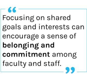 Therefore, focusing on shared goals and interests can encourage a sense of belonging and commitment among faculty and staff, which is essential for retention and engagement.