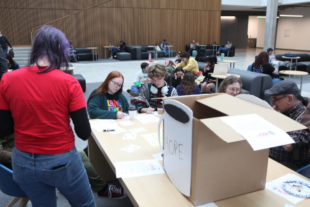 Messages were posted on a whiteboard, placed in a box labeled “Hope” with a mug icon, and then carried to the president’s office in Salazar Hall.