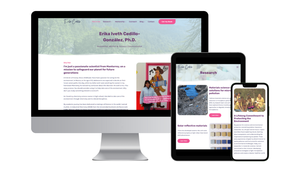 Jennifer van Alstyne: Personal and professional with pops of color. This website shares Dr. Erika Iveth Cedillo-González’ passion for science. It has science communication that invites the general public to learn and engage. There’s clarity not only on what the research is about, but how it impacts people. Accessible communication without sacrificing the science, in this website you get both.